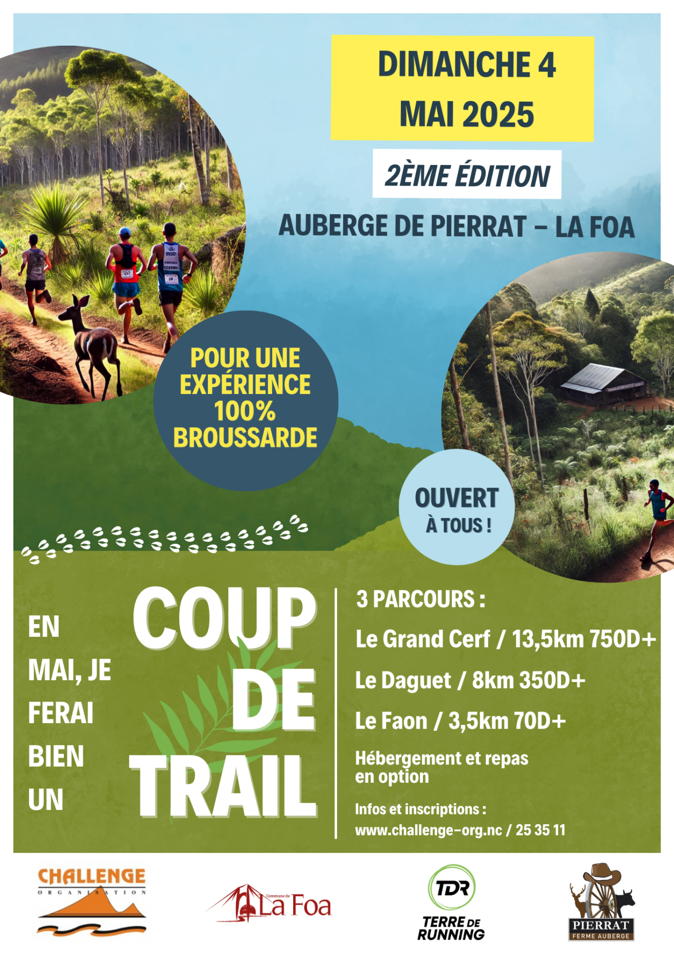 A ce qu'il parait, "en mai, fais ce qu'il te plaît" ... Alors Challenge Organisation vous propose de faire un nouveau Coup de Trail à La Foa, le dimanche 4 mai ! Au départ de l'auberge de Pierrat, 3 parcours vous sont ouverts pour l'occasion :